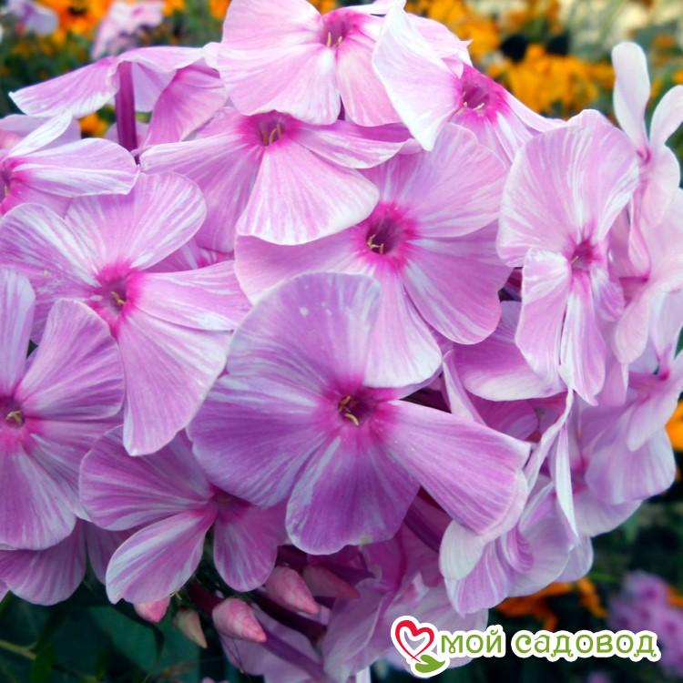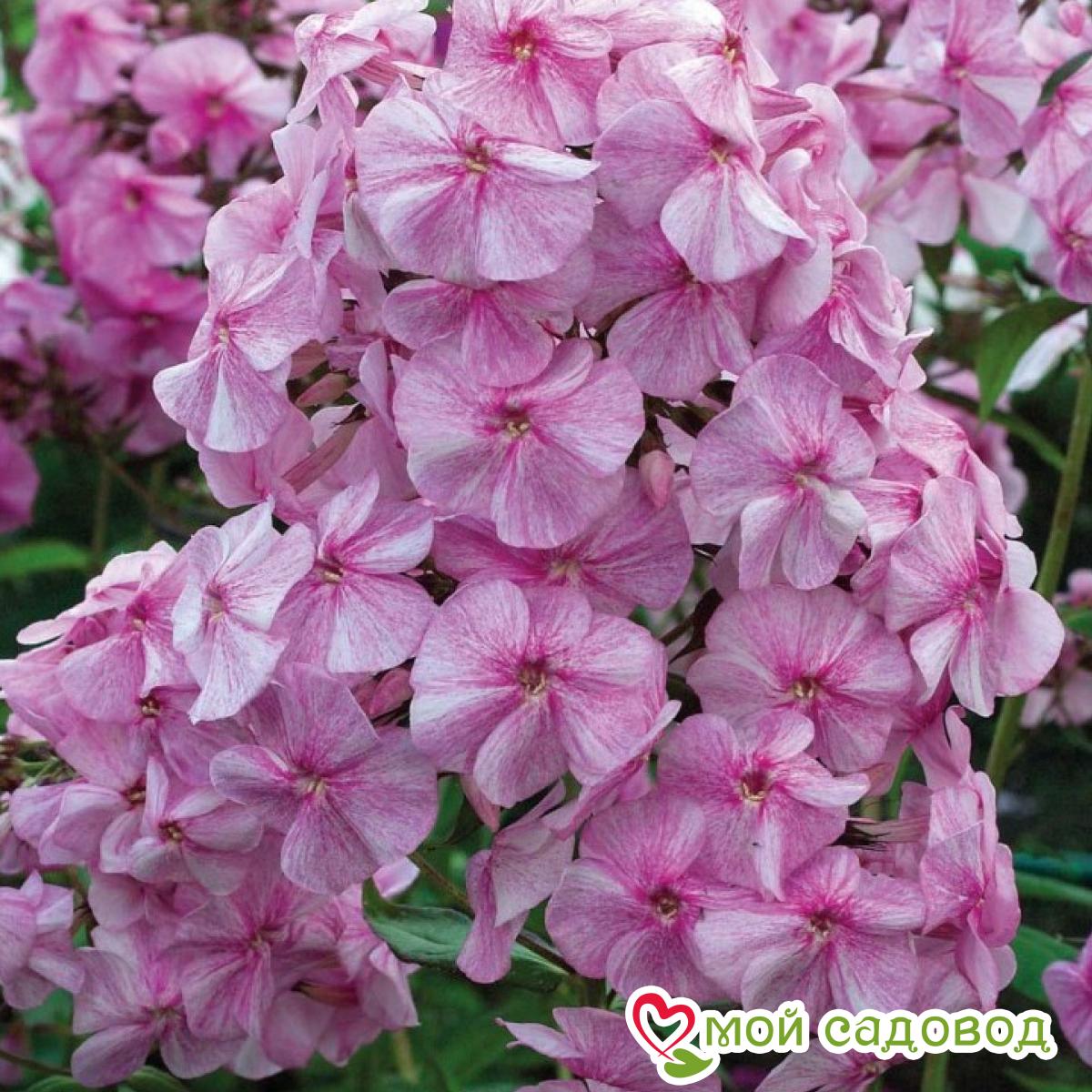 Цветы имеют необычный окрас с нежными бело-розовыми мазками. Диаметр цветка до 4 см. Высота флокса – 45-55 см. Цветение июль-август.